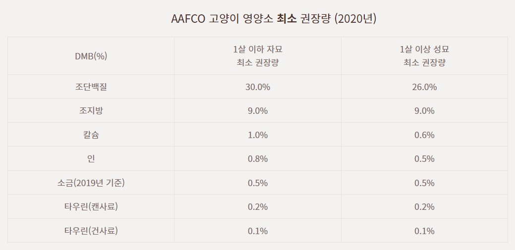 미국사료협회(AAFCO) 에서는 고양이의 최소 영양소 권장량을 제공하고 있다.
