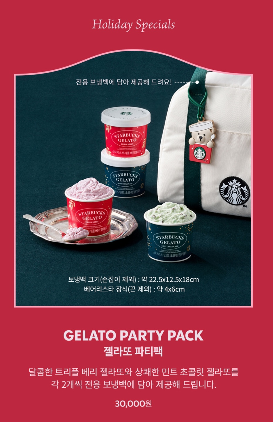 | 증정 혜택 | 음료 쿠폰 1장, 홀리데이 캔들 *젤라또 파티팩은 홀리데이 캔들 미증정 *아이스크림 케이크/ 젤라또 파티팩 구매 시, 전용 보냉백 증정 |